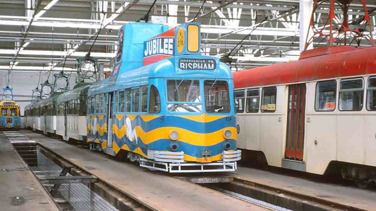 Stored from 1974 requiring overhaul, 634 returned to use in 1976 with all the standard 1970’s modifications but looking stunning in a special blue and yellow livery promoting the centenary of Blackpool’s incorporation as a Borough.