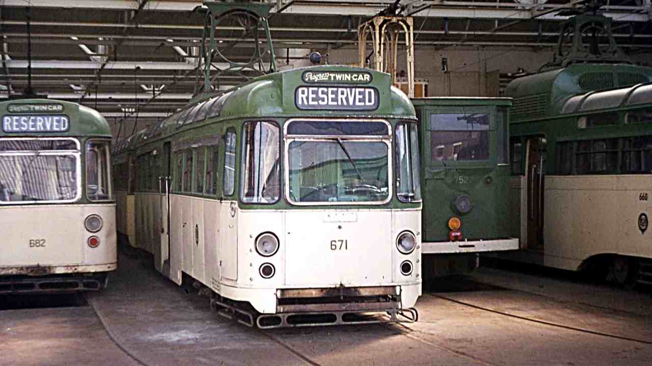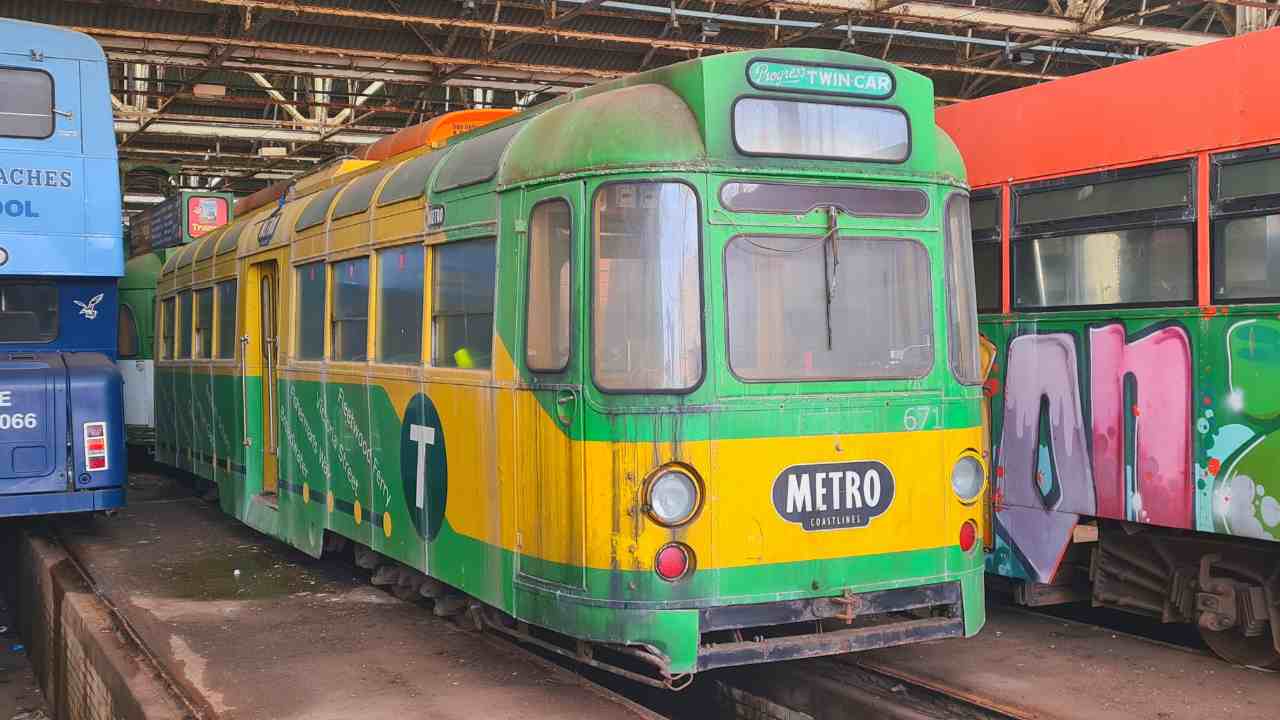 As part of the rundown of the traditional fleet prior to the tramway upgrade, 671+681 were withdrawn in October 2010. The Twin set was initially acquired by Merseytravel for a proposed scheme on the Wirral and moved to a storage yard in Knowsley in December 2011. However, 671 returned to Blackpool in February the following year now in the care of the Lancastrian (now Fylde) Transport Trust, separating the tram from its trailer, and it spent three years in a yard in Marton. In 2015, 671 finally made it back home to Rigby Road depot in a deal which saw ownership transfer to the Blackpool Heritage Trust (BHT).